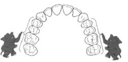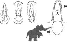 Рис. 13.63. Наклонно-вращательное перемещение зуба. При ортодонтическом лечении перемещают не только отдельные зубы, но и группу зубов (переднюю, боковую). В некоторых случаях возникает необходимость в перемещении всего верхнего или нижнего зубного ряда. Например, при лечении дистальной окклюзии, обусловленной дистальным положением нижней челюсти, возникает необходимость в выдвижении нижней челюсти с целью нормализации окклюзии зубных рядов. Ортодонтическое лечение основано на передаче сил на зубы, зубные ряды, челюстные кости и лицевой скелет в целом. При этом следует рассматривать три компонен- та: действующую силу, приложение действующей силы и опору. В орто-