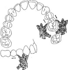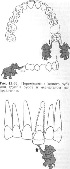 Рис. 13.59. Дистальное перемещение одного зуба или группы зубов. вертикальных аномалиях окклюзии зубы перемещают в том же направлении — это так называемые зубо- альвеолярные удлинение и укорочение — внедрение (рис. 13.61). И последний из видов перемещения зубов — это повороты по вертикали (тортоповороты) — центральные и эксцентрические (рис. 13.62). Основные виды перемещения зубов — корпусное и наклонно-вращательное. При корпусном перемещении зубов предусматривается одновременное перемещение корня и коронки зуба только в одном направлении, т.е. в этом случае корень и коронку зуба перемещают на одинаковое расстояние. Движение в одном, например в вестибулярном направлении, является корпусным перемещением зуба. К движениям в одном направлении относятся повороты зуба, а также интрузия и экструзия зубов по вертикали. При наклонно-вращательном перемещении зуба подразумевается перемещение корня и коронки зуба на разное расстояние. Сила, используемая для перемещения зуба, различна для корня и коронки. Причем в зависимости от поставленной задачи в одних случаях на корень зуба может быть воздействие большей силы, а на коронку зуба — меньшей; в других случаях, наоборот: на коронку зуба приходится большая сила, а на корень меньшая (рис. 13.63). Наклонно-вращательное перемещение зуба может происходить вдоль по зубному ряду (перемещение зуба в двух направлениях), т.е. коронка зуба может перемещаться дистально, а корень зуба мезиально, или наоборот. Один из видов перемещения зубов в мезиодистальном направлении — инклинация, т.е. коронка или корень зуба наклонены в мезиодистальном направлении. В этом случае следует инклиниро-вать аномально расположенный зуб. Перемещение зуба в двух направлениях — это
