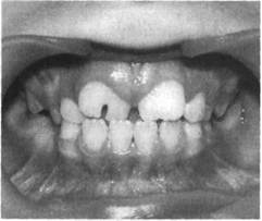 Рис. 13.64. Сверхкомплектный зуб между центральными резцами. Клиническая картина. Зубы, прорезавшиеся сверх нормального количества, называются сверхкомплектными. В периоде прикуса молочных зубов это встречается крайне редко. Гиперодонтия выявляется при осмотре рта. В основном сверхкомплектные зубы прорезываются вне зубного ряда, вызывая различные смещения рядом расположенных комплектных зубов (рис. 13.64). Иногда они прорезываются в зубном ряду, практически не вызывая нарушений. Часто сверхкомплектные зубы не прорезываются, оставаясь в толще костной ткани челюсти и, как правило, занимая атипичное положение. Эти зубы, за редким исключением, бывают неправильной формы, их размеры не соответствуют размерам комплектных (это касается как коронковой части зуба, так и корневой). Внутричелюстное расположение сверхкомплектных зубов диагностируется рентгенологически, однако и при осмотре рта можно выявить утолщение альвеолярного отростка в соответствующем участке, иногда с четким рельефом, отображающим коронковую часть зуба. Визуальные данные уточняют пальпаторно. Диагностика. Сверхкомплектные зубы определяют посредством при- цельной внутриротовой рентгенографии. При изучении внутрирото-вых рентгенограмм оценивают взаиморасположение и форму сверхкомплектного зуба и зачатков или корней постоянных зубов, состояние периодонтальных тканей. Панорамная рентгенография позволяет диагностировать сверхкомплектные зубы отдельно на верхней и нижней челюсти, ортопантомог-рафия — на обеих челюстях одновременно. Преимущество этих методов диагностики сверхкомплектных зубов в том, что они дают исчерпывающую информацию, точно и полно отображают топографию и позволяют тщательно изучить исследуемые структуры. Гиподонтия диагностируется при осмотре рта путем сопоставления хронологического и зубного возраста. Отсутствие каких-либо зубов в зубном ряду по истечении сроков их прорезывания дает повод предполагать их полное отсутствие. Косвенный повод для такого предположения — недоразвитие альвеолярного отростка по толщине и высоте в соответствующем участке. Пальпаторно следует уточнить данные визуального обследования. Как правило, зубы, расположенные по краям дефекта, смещаются в его сторону. Если при осмотре рта выявляется локальный дефект в зубном ряду, диагноз уточняют посредством прицельной внутриротовой рентгенографии. При множественной гиподонтии, так же как и при наличии сверхкомплектных зубов, целесообразно использовать панорамную рентгенографию или ортопантомографию. Полная первичная адентия — явление чрезвычайно редкое. Эта тяжелая форма аномалии, при которой отсутствуют зачатки зубов, имеются симптомы, выявляемые при осмотре лица, так как они сочетаются с нарушением развития лицевого скелета в целом. При адентии отмечаются уменьшение гнатической области лица и нижней морфологической высоты лица, резко выраженная супраментальная складка. Причиной полной первичной адентии чаще всего является ангидротическая эктодермальная дисплазия, в связи с чем следует акцентировать внимание на состоянии кожных покровов: при этом заболевании наблюдаются сухость, бледность, морщинистость кожи, отсутствие волос или малое их количество в виде своеобразного пуха. При осмотре рта отмечаются сухость и бледность слизистой 