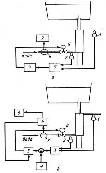 Рисунок 4.5 – Схема управления тепловым режимом кристаллизатора: а) по перепаду температур охлаждающей воды; б) по соотношению расход охлаждающей воды – перепад температур. Контролируемой величиной выбрана разность температур на выходе входе кристаллизатора, измеряемая с помощью термометров сопротивления 1 и 2, преобразователя 3 и регулятора-регистратора 4. При отклонении температурного перепада от заданного значения расход воды изменяется с помощью клапана пневмопривода 5 в направлении восстановления заданного перепада температур. Расход воды измеряется с помощью расходомера 6, преобразуется в электрический сигнал преобразователем 7 и записывается на приборе 4. На Рисунке 3.5 б) приведена другая схема, выполненная на стандартной аппаратуре, обеспечивающая автоматическое регулирование соотношения расхода охлаждающей воды и перепада температур. Схема работает следующим образом. Температура охлаждающей воды также измеряется термометрами сопротивления 1 и 2, электрические сигналы от которых алгебраически суммируются в датчике температурного перепада 3. Полученная разность поступает на задающий регулятор температурного перепада 4. С выхода регулятора 4 сигнал проходит на регулятор соотношения 5, на другой вход которого поступает сигнал от преобразователя 6 расходомера охлаждающей воды 7. При отклонении температурного перепада от заданного значения регулятор соотношения 5 воздействует на клапан подачи охлаждающей воды 8 в направлении ликвидации этого отклонения, однако уже не до нуля, а до некоторой остаточной величины, определяемой встречным сигналом от расходомера 7 и настройкой регулятора соотношения. Запись температурного перепада и расхода воды осуществляется в двухперьевом регистраторе 9. Таким образом, в этом случае система поддерживает температурный перепад с некоторой неравномерностью по тепловой нагрузке кристаллизатора. Несмотря на это, схема имеет существенное преимущество по сравнению с предыдущей: всякие самопроизвольные отклонения в подаче охлаждающей воды энергично устраняются регулятором соотношения, практически не сказываясь на тепловом режиме кристаллизатора. При отклонении температуры охлаждающей воды на входе в кристаллизатор от расчётного значения обе системы начинают работать нерационально, уменьшая подачу охлаждающей воды при повышении её температуры на входе в кристаллизатор и увеличивая при понижении. Это приводит к увеличению расхода воды на охлаждение кристаллизатора и соответственно к увеличенному расходу электроэнергии на собственные нужды. Рассмотрим систему автоматического управления тепловым режимом кристаллизатора, обеспечивающую перестройку поддерживаемого температурного перепада по температуре входящей в кристаллизатор охлаждающей воды. Система представлена на рисунке 6.