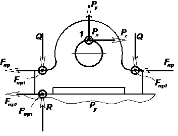 Сила Py стремится оторвать заготовку от установочной поверхности. Этому противодействуют усилия закрепления Q. Осевая сила Px стремится сдвинуть заготовку вдоль оси обрабатываемого отверстия. Этому противодействуют силы трения Fтр1, которые возникают в точках приложения усилий закрепления Q, а также сила трения F’тр1, которая возникает в точке возникновения реакции R на установочной поверхности. Тангенциальная составляющая силы резания Pz стремится сдвинуть заготовку в направлении перпендикулярном оси обрабатываемого отверстия. Этому противодействуют силы трения Fтр, которые возникают в точках приложения усилий закрепления Q, а также сила трения F’тр, которая возникает в точке возникновения реакции R на установочной поверхности.