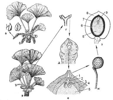 Рис. 29. Гинкго двулопастный: а – микроспорофилл с микроспорангиями; б – побег спорофита с мужскими сережковидными шишками; в – побег спорофита с женскими шишками; г – женская шишка; д -, е – семязачаток (продольный разрез); ж -, з – семя (внешний вид и продольный разрез): 1 – сочный интегумент; 2 – архегониальная камера; 3 – архегоний; 4 – нуцеллус; 5 – эндосперм; 6 – тонкий пленчатый слой; 7 – каменистая часть; 8 – наружная мясистая часть покрова семени; 9 – зародыш