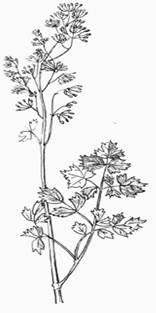 Чернушка естественно произрастает в Крыму, на Кавказе, а также в Средиземноморье. В России культивируется как декоративное и лекарственное растение. Василистник малый (Thalictrum minus) (рис. 46, б) сем. лютиковые – Ranunculaceae – травянистое многолетнее растение с укороченным корневищем и придаточными корнями. Стебель прямой, гладкий и равномерно облиственный, высотой до 1,5 м. Листья очередные – верхние листья более мелкие, сидячие; средние – черешковые, трижды-, четыреждыперистые; нижние листья – тройчатые. Пластинка листьев округлой формы, на верхушке они трехлопастные. Цветки мелкие, поникающие. Простой околоцветник состоит из четырех зеленовато-красноватых лепестков. Тычинки повислые, их много, пыльники снабжены остроконечием. Формула цветка: *P4A10-15G 3-7. Плод – ребристо-шереховатый серо-зеленый орешек продолговато-яйцевидной формы, длиной 1 мм. Собранная в период цветения и высушенная трава василистника малого используется в качестве лекарственного средства, входит в состав сборов.