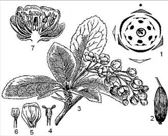 Рис. 47. Барбарис обыкновенный: 1 – диаграмма цветка; 2 – плод; 3 – цветущий побег; 4 – пыльник с открытыми коапанами; 5 – лепесток с нектарником; 6 – пыльник с закрытыми клапанами; 7 – продольный разрез цветка