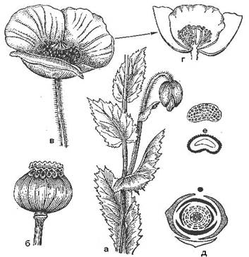 Рис. 50. Мак-самосейка: а – цветоносный побег; б – плод – коробочка; в – г – цветок (общий вид и продольный разрез); е – семя (общий вид и продольный разрез); д – диаграмма цветка