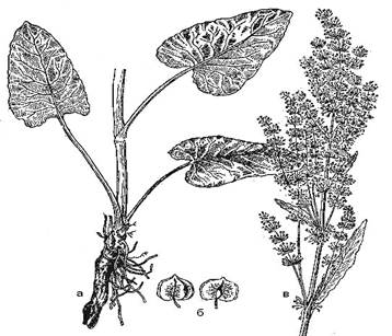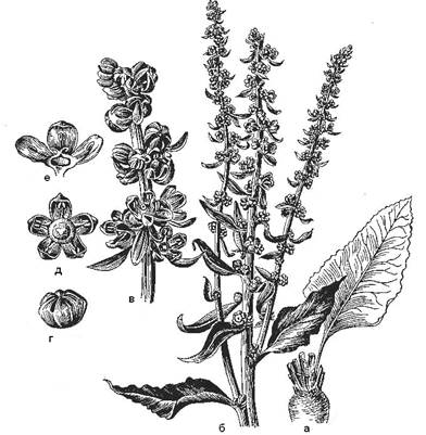 Рис. 55. Щавель конский: а – нижняя часть побега с корнем; б – семена; в – соцветие