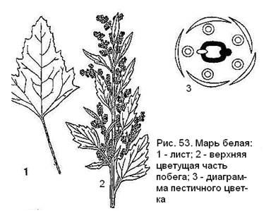 Делают вывод, что плоды свеклы являются соплодиями-клубочками. Поэтому всходы свеклы на грядках всегда появляются кучками и их надо прореживать. Зарисовывают цветок, его продольный срез, диаграмму цветка. Марь белая (Chenopodium album) (рис. 53) – широко распространенный однолетний злостный травянистый сорняк высотой 10 – 50 см и более. Стебли у мари пятигранные, ветвистые.