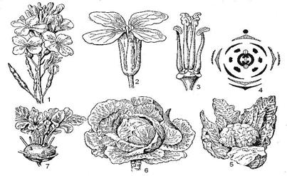 Рис.82. Капуста: 1 – соцветие с цветками и плодами; 2 – цветок; 3 – андроцей и гинецей; 4 – диаграмма цветка; 5 – цветная капуста; 6 – белокочанная капуста; 7 – кольраби