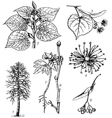Рис. 83. Липа сердцелистная: 1 – габитус липы; 2 – распустившийся побег с молодыми листьями и прилистниками; 3 – соцветие с прицветником; 4 – цветок (вид сверху); 5 – плоды с прицветником; 6 - удлиненный побег с почками; 7 – проросток липы