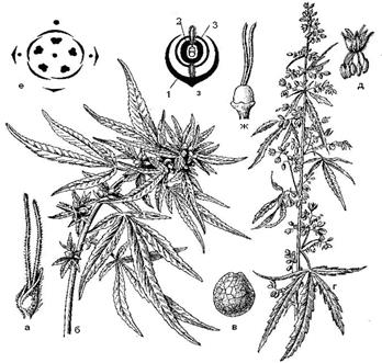 Рис. 88. Конопля посевная: а – пестичный цветок, окруженный кроющим листом; б – цветущий пестичный побег; в – плод; г – цветущий тычиночный побег; д – тычиночный цветок ж – пестичный цветок; з – диаграмма пестичного цветка; е – диаграмма тычинорчного цветка