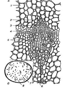 Рис. 90. Поперечный срез корневища родиолы розовой: а – часть поперечного среза корневища через проводящий пучок; б – схема поперечного среза корневища под лупой; 1 – паренхима; 2 – облитированные ткани; 3 – флоэма проводящего пучка; 4 – камбий; 5 – ксилема; 6 - неполный проводящий пучок; 7 - проводящие пучки; 8 – пробка.