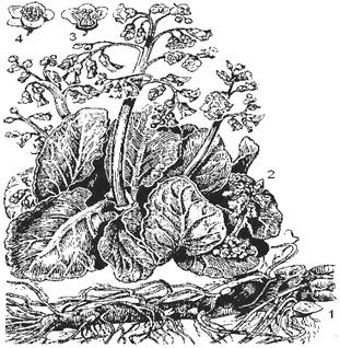 Рис. 91. Бадан толстолистный: 1 – корневище с придаточными корнями; 2 – цветущий побег; 3 – цветок в продольном разрезе; 4 – общий вид цветка