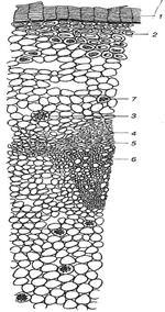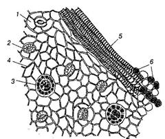 а б Рис. 92. Бадан толстолистный: а – часть поперечного среза корневища: 1 – пробка; 2 – клетки, содержащие флобафены; 3 – друза; 4 – флоэма; 5 – камбий; 6 – сосуды древесины; 7 – крахмальные зерна; б – эпидермис листа с поверхности: 1 – клетка эпидермиса; 2 – устьице; 3 – железка; 4 – четковидно утолщенные стенки клеток; 5 – сосуд жилки; 6 – друзы в мезофилле листа