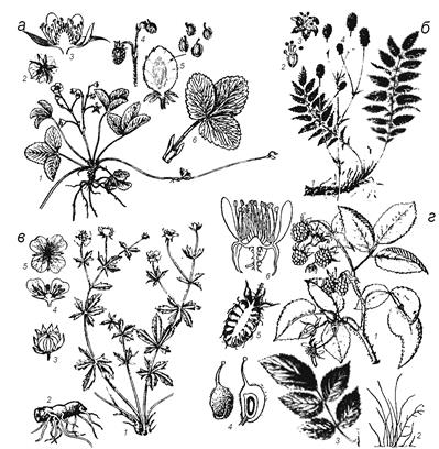 Рис. 95. Подсемейство шиповниковые: а – земляника лесная: 1 – цветущее растение с столонами; 2 – цветок (вид снизу); 3 – продольный разрез цветка; 4 – плоды – сочный многоорешек; 5 - плод в продольном с пестиками; 6 – тройчатый лист с прилистниками; б - кровохлебка лекарственная: 1 – побег с корневищем; 2 – пестик; 3 – цветок; 4 – соцветие; в - лапчатка прямостоячая: 1 – общий вид побега; 2 – корневище; 3 – плод; 4 – цветок в продольном разрезе; 5 – цветок (вид снизу); г - малина обыкновенная: 1 – цветуще-плодоносящая ветка; 2 – внешний вид куста; 3 – лист; 4 – пестик (внешний вид и продольный разрез); 5 – плод – сборная многокостянка в продольном разрезе; 6 – цветок в продольном разрезе
