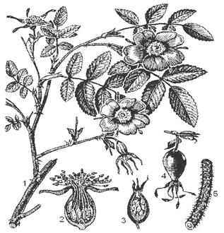 Корневище вертикальное, деревянистое, разветвленное и веретеновидным корнем. Стебли прямостоячие или восходящие (приподнимающиеся), округло-граненные, покрыты белыми шерстистыми волосками. Листья очередные, с двумя ланцетными прилистниками, простые, пальчато-пятираз-дельные на клиновидные или продолговато-ланцетные доли, сверху зеленые, голые или покрыты простыми волосками, снизу серебристо опушенные. Край листа пильчатыми зубцами, загнут вниз. Нижние листья черешковые, верхние – сидячие. Соцветие – щитковидная метелка. Цветоножки после цветения прямостоячие или отклоненные. Цветки желтые, пятичленные, некрупные. Гипантий блюдцевидный. Чашечка и подчашие из пяти зеленых листочков. Венчик состоит из пяти свободных обратно-яйцевидных лепестков, с выемкой на верхушке. Тычинок много, прикрепляются к краям гипантия. Многочисленные пестики располагаются на выпуклом цветоложе, завязь верхняя. Формула цветка лапчатки серебристой: *Ca(5+5)Co5A∞G ∞. Плоды – многоорешки. Земляника лесная (Fragaria vesca) (рис. 95, а)– небольшое многолетнее травянистое растение с коротким косым корневищем, многочисленными придаточными корнями и длинными тонкими ползучими побегами, укореняющимися в узлах, обеспечивающих вегетативное размножение. Листья прикорневые с длинными черешками, тройчатосложные. Листочки сидячие, эллиптические крупнозубчатые, шелковисто-волокнистые. Ползучие и укореняющиеся побеги – усы развиваются из пазух листьев. Цветки обоеполые, на длинных цветоножках, собраны в щитковидные, компактные соцветия. Цветонос на верху разветвляющийся. Цветоножка покрыта волосками, направленными вверх. Чашечка и подчашие состоят из пяти листочков и легко отделяются от плода. Венчик из пяти свободных белых лепестков. Цветоложе удлиненно-выпуклое с многочисленными пестиками. Формула цветка земляники лесной: *Ca(5+5)Co5A∞G ∞. Плод – яйцевидный, красный, душистый, ложный, сочный многоорешек (земляничина), образованный разросшимся мясистым цветоложем с сидячими на нем плодиками-орешками. Высушенные листья и зрелые плоды используют в качестве лекарственного средства. Шиповник майский (ш. коричный) – Rosa majalis (R. сinnamomea) (рис. 97). Наиболее распространенный кустарник до 2,5 м высоты, с тонкими ветвями, покрытыми корич-нево-красной корой. . Рис. 97. Шиповник коричный, или майский: 1 – цветущий побег; 2 – гипантий; 3 – плод в продольном разрезе; 4 – плод; 5 – часть цветоносной ветки