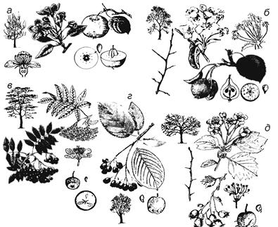 Рис. 98. Подсемейство яблоневые: а – ябоня домашняя; б – груша обыкновенная; в – рябина обыкновенная; г - арония черноплодная; д – боярышник кроваво-красный