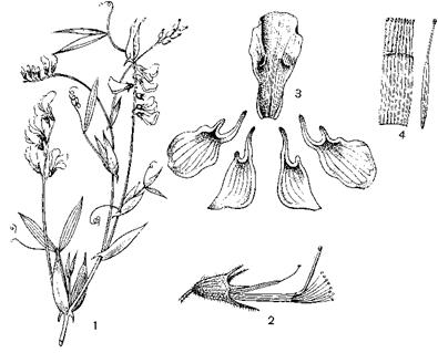Рис. 101. Чина луговая: 1 – цветущий побег; 2 – цветок после удаления венчика; 3 – венчик в разобранном виде; 4 – тычинки в развернутом виде