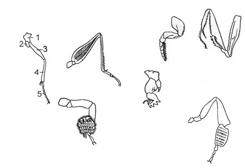 Рис. 99. Экологическая радиация конечностей насекомых.