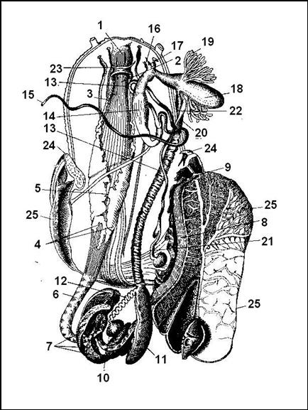 1 – глотка; 2 – пищевод; 3 – протоки слюнных желез; 4 – слюнные железы; 5 – зоб; 6 – желудок; 7 – печень; 8 - прямая кишка; 9 – анус; 10 – гермафродитная железа; 11 – белковая железа; 12 – семяяйцепровод; 13 – семяпровод; 14 – мешок пениса; 15 – бич; 16 – половая клоака; 17 – влагалище; 18 – мешок «любовной стрелы»; 19 – пальцевидные железы; 20 – яйцевод; 21 – семяприемник; 22 – канал семяприемника; 23 – надглоточный ганглий; 24 – край мантии; 25 – легкое.