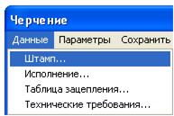 Рис. 5.17 После нажатия на кнопку «Данные» (рис. 5.18) имеется возможность заполнить основную надпись (рис. 5.19) (необходимо нажать кнопку «Штамп»), заполнить технические требования (необходимо нажать кнопку «Технические требования») и выбрать вариант исполнения шкива (необходимо нажать кнопку «Исполнение»). Нажатие кнопки «Исполнение» позволяет последовательно выбрать тип ступицы (рис. 5.20), тип соединения ступицы с валом (рис. 5.21), размеры конструкции шкива (рис. 5.22). Параметры чертежа выбираются кнопкой «Параметры» падающего меню (рис. 5.17).