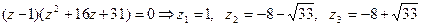 Положим Так как сумма коэффициентов последнего уравнения равна 0 (1+15+15-31=0), тогда z = 1 является корнем уравнения, значит, левая часть его делится на