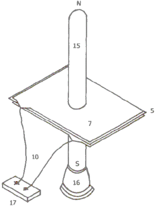 Рис.3 показывает основное устройство, где в качестве активного диполя использована "Плазменная лампа" (декоративные лампы в виде шара или продолговатой формы, как здесь, где используется высоковольтный разряд для получения визуальных эффектов плазменных струй, особенно при прикосновении к лампе рукой). Здесь 5 - диэлектрик из листового пластика, изолирующий пластины конденсатора 7, верхняя пластина алюминиевая, а нижняя - медная. 10 - выводы конденсатора. 15 -плазменная лампа. Размеры лампы - высота 1,22 м и диаметр 100 мм. Высоковольтный источник питания лампы помечен цифрой 16. Клеммы подключения кондесатора при проведении экспериментов - 17.