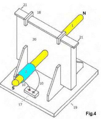 Рис.2 части A и B устройства. На рис. 2А 1 - отверствие в пластинах конденсатора, через которое продевается диполь. На рис. 2В изображен диполь с полюсами N и S. 2 - резонансная высоковольтная катушка индуктивности, насаженная на диполь 1. 5 -Диэлектрик изолирующий пластины кондесатора, представляет собой тонкий лист пластика, помещенный между двумя пластинами конденсатора 7. Верхняя пластина изготовлена из алюминия, а нижняя из меди. Устройство 8 – аккумуляторная батарея глубокого цикла заряд-разряда, питает инвертор 9, который преобразовывает заряд батареи в напряжение сети, которое можно использовать для нужд. Цифрами 10 обозначены провода подключения высоковольтного питания (устройство 11), как напр. трансформатор питания газоразрядных неоновых ламп со своим преобразователем осциллирующего напряжения.
