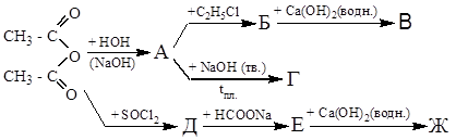 5. Исходя из уксусной и масляной кислот получите синтезом Вильямсона уксусно-масляный ангидрид с предварительным получением их галоген- и металлпроизводных, приведите оба варианта выхода на смешанный ангидрид. 6. Имея Са(ОН)2 и сильный окислитель, превратите пробковую (октандиовую) кислоту в адипиновую (гександиовую). 7. Имея Cl2, AlCl3, KCN,