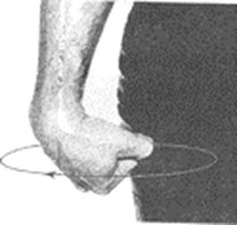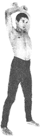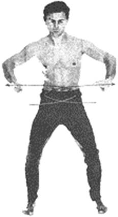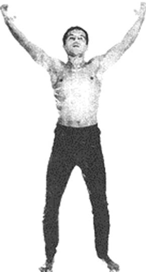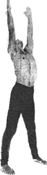 10.7. Как только появится ощущение, что жгуты зафиксированы, с быстрым мощным вдохом молниеносно выбросить выпрямленные руки вертикально вверх, проследив за ними взглядом. Голова слегка запрокидывается назад, ноги полностью выпрямляются. Этим движением руки будут полностью «отклеены» от жгутов, а за счет вдоха свежая энергия, поступившая в энергетическое тело, окажется втянутой внутрь энергетической копии физического тела. После этого она уже полностью превратится во внутреннюю составляющую энергетического тела. С плавным выдохом медленно опустить руки, стараясь ничего не «зацепить» в «дыре над головой», и согнуть ноги в коленях - рабочая стойка (рис. 10.7). На этом заканчивается первый полуцикл десятого магического действия «Проникнуть в дыру над головой». 10.8. Выполнить три круговых движения кистями возле бедер, аналогичных движениям, выполнявшимся в первом полуцикле, но на этот раз направленных наружу (рис. 10.8). 10.9. Поднять руки вверх по широкой восходящей спирали. Пять витков, направление - наружу (рис. 10.9). 10.10. Ударом изнутри-наружу с быстрым вдохом ухватиться за сердцевины энергетических «подушек» в «дыре над головой» (рис. 10.10). 10.11. Сквозь «дыру над головой» по широкой нисходящей спирали втянуть энергетические «подушки» и тянущиеся за ними жгуты энергии внутрь кокона. Пять витков, направленных наружу (рис. 10.11). 10.12. Прижать кулаки к бедрам (рис.10.5(г)), расправить ладони (рис. 10.6), немного выждать и с резким вдохом «метнуть» руки вверх, как это делалось в первом полуцикле (рис. 10.7(а-д)). 10.13. С медленным выдохом осторожно опустить руки (рис. 10.7(е-и)). На этом заканчивается второй полуцикл десятого магического движения ТЕНСЁГРИТИ «Проникнуть в дыру над головой».