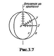 В обыкновенном луче колебания светового вектора происходят в направлении, перпендикулярном к главному сечению кристалла (на рис.3.8 эти колебания изображены точками на соответствующем луче). Поэтому при любом направлении обыкновенного луча (на рис.3.7 указаны три направления: 1, 2 и 3) вектор