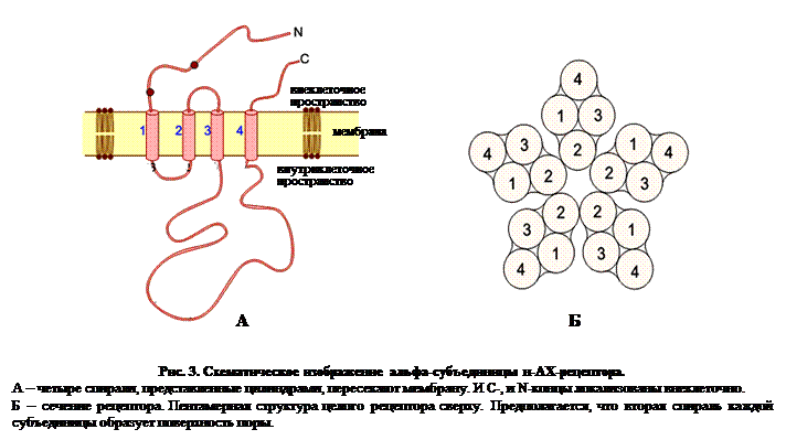Каждая из субъединиц образует 4 трансмембранных сегмента (4, а), а все вместе 5 субъединиц компактно собраны вокруг центральной ионной поры (рис. 4, б). Когда лиганд, в данном случае ацетилхолин (АХ), присоединяется к сайтам связывания двух альфа-субъединиц, канал открывается и одновалентные катионы двигаются по электрохимическому градиенту.