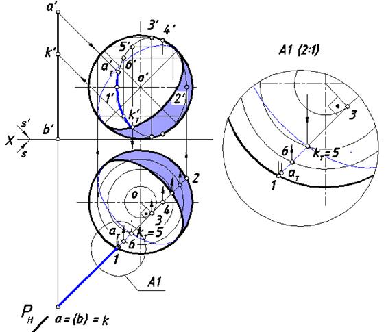 Наличие собственной тени для решения поставленной задачи необходимо. Способ ее нахождения изложен ранее. Применять способ обратных лучей для этой задачи нерационально, поскольку по условию не требуется определение падающих теней шара. Подойдем к решению задачи следующим образом. Из аналитической геометрии известно, что любая плоскость пересекает сферу по окружности. Лучевая плоскость, проходящая через отрезок [ AB ] – горизонтально-проецирующая, поэтому пересекает сферу по окружности, которая на горизонтальной проекции отобразится отрезком прямой [ 12 ].