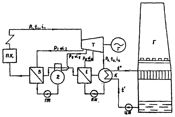 Действительный процесс расширения пара в турбине показан на схеме линией 1-2 д. Точки I, II, III характеризуют состояния пара в отборах турбины. Процесс конденсации пара представлен изотермой 2g–3, которой соответствует давление пара Процесс сжатия питательной воды в насосах (конденсатном и питательном) от давления Изобара 7–8 (она же изотерма) иллюстрирует процесс парообразования воды в котле, и изобара 8–1 показывает процесс перегрева пера от температуры насыщения Изобары
