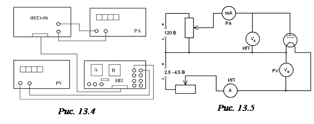 Амперметр на панели источника питания служит для контроля тока накала I Н, максимальное значение которого не должно превышать 2.2 А. Плавная регулировка напряжения накала осуществляется ручкой, расположенной под амперметром. Напряжение накала U Н измеряется вольтметром (PV), который подключается к тем клеммам на источнике питания, где указано напряжение 2,5–4,5 В. Вольтметр на панели источника питания измеряет анодное напряжение U А, регулировка которого осуществляется ручкой на панели источника питания, расположенной непосредственно под вольтметром. Для измерения анодного тока I А используется амперметр, который подключается к модулю ФПЭ-06 к клеммам РА. Он должен работать в режиме миллиамперметра, измеряя ток до 20 mA.