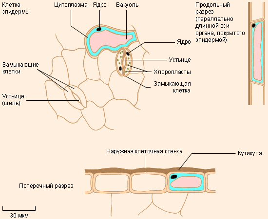 3. Рассмотрите рисунок листа. Зарисуйте его в тетради, указав в нем основные ткани разными цветами.