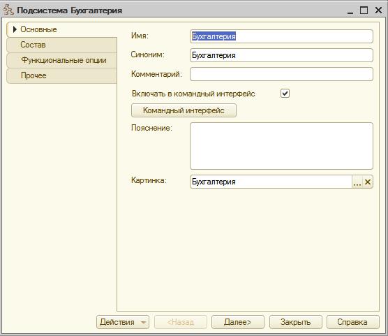 Зададим имя подсистемы – «Бухгалтерия». На основании имени платформа автоматически создаст синоним – «Бухгалтерия».