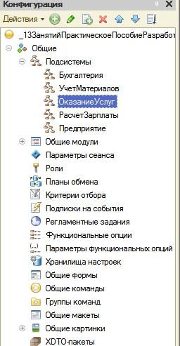 Каждый объект конфигурации может быть включен в одну или сразу несколько подсистем, в составе которых он будет отображаться. Сейчас мы создадим в нашей конфигурации пять новых объектов конфигурации Подсистема, которые будут иметь имена: «Бухгалтерия», «РасчетЗарплаты», «УчетМатериалов», «ОказаниеУслуг» и «Предприятие». Чтобы это сделать, выполним следующие действия.