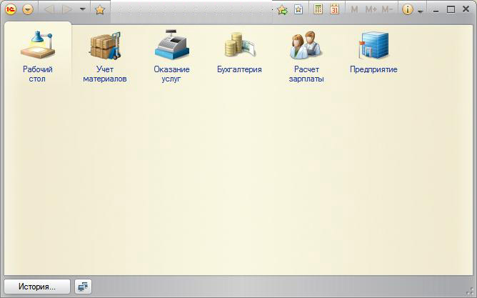 Панель разделов прикладного решения в режиме 1С:Предприятие: Запустим 1С Предприятие в режиме отладки и увидим результат наших изменений. Вид разрабатываемого нами приложения изменился. Сразу под главным меню располагается панель разделов приложения, где и отражены созданные нами подсистемы. Причем все разделы выводятся с выбранными в их свойствах картинками. Разделы представлены в форме гиперссылок, нажав на которые пользователь может открыть связанные с ними документы, справочники, отчеты и т. п. Обратите внимание, что раздел Рабочий стол формируется платформой по умолчанию. Он предназначен для размещения наиболее часто используемых пользователем документов, отчетов и т. п.