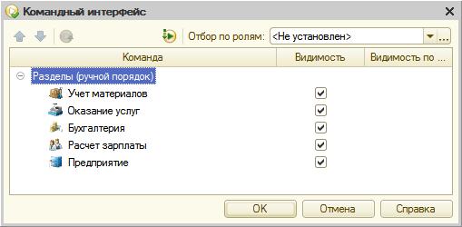 Порядок разделов в режиме Конфигуратор: Однако порядок расположения подсистем нас не совсем устраивает. Изменим его. Закроем приложение и вернемся в конфигуратор. Выделим корень дерева объектов конфигурации «Фамилия», нажатием правой кнопки мыши вызовем контекстное меню и выберем пункт «Открыть командный интерфейс конфигурации» В открывшемся окне «Командный интерфейс» вы увидите список созданных вами подсистем (разделов приложения). Расположим сначала подсистемы, отражающие производственную деятельность нашей фирмы: «Учет материалов» и «Оказание услуг», затем бухгалтерскую деятельность и расчет зарплаты сотрудников: «Бухгалтерия» и «Расчет зарплаты», а затем подсистему «Предприятие».