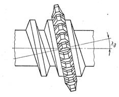 схемы нарезания червяков резцом а-архимедов; б - эвольвентный; в - конволютный В крупносерийном и массовом производстве на токарных станках нарезают червяки специальными кольцевыми головками по принципу вихревого нарезания резьбы. В серийном и массовом производстве нашёл применение способ нарезания цилиндрических червяков дисковыми фрезами на фрезерных станках. При этом ось фрезы и нарезаемого червяка развёрнуты относительно друг друга на угол подъёма витка червяка. Этот метод в основном используется для чернового нарезания профиля.