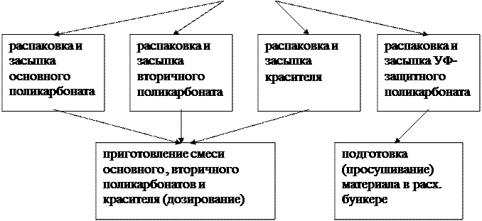 Сырьё и материалы хранятся в сухом прохладном помещении без попадания прямых солнечных лучей на поддонах или в герметичных ёмкостях с разделением по партиям и поставщикам. Не допускается применение влажных материалов. Если при транспортировке в сырьё попала влага, необходимо просушивать материал в течение не менее 4 часов при температуре 120 градусов горячим воздухом. Защитная плёнка хранится на специальных поддонах, исключающих слипание слоёв плёнки при хранении, либо в вертикальном положении. Материалы засыпаются в расходные ёмкости (бункеры) с помощью погрузчика. При растарке и засыпке материала из транспортировочной тары поддон, на котором находиться поликарбонат, тщательно обдувается сжатым воздухом для предотвращения попадания посторонних включений в массу материала. Вторичный (дроблёный) материал хранится в биг-бегах отдельно по цветам и концентрациям. Каждое место имеет бирку с указанием цвета, веса, даты изготовления и указанием толщины измельчённого листа, так как для каждой толщины листа должна быть своя концентрация красителя. Из расходных ёмкостей с помощью пневмотранспорта материал поступает в дозатор, имеющий бункеры для первичного сырья, вторичного сырья, красителя. С пульта оператора задаётся процентное соотношение между компонентами смеси.
