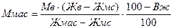 де Рм - норма витрати молока на 1 т масла, т; Жв - масова частка жиру у вершках, при якій встановлено норматив масової частки жиру в мслянціі,%; Жзн.м - масова частка жиру в знежиреному молоці,%; Жмас - масова частка жиру в маслі,%; Жмс - масова частка жиру в маслянці,%; Жм - масова частка жиру в молоці,%; П1 - норма втрат жиру при виробленні вершків у % від масової частки жиру в просепарованому молоці; П2 - норма втрат жиру при переробці вершків у масло в % від масової частки жиру в них. Масову частку жиру в маслі розраховують за формулою: