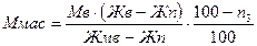 де Мзнеж.м – маса знежиреного молока, кг; Рм - нормативна витрата молока на 1 т масла конкретного асортиментного найменування, кг; Жв - масова частка жиру у вершках,%; Жм - масова частка жиру в молоці,%; Жзн.м - масова частка жиру в знежиреному молоці,%; П1 - норма втрат сировини при отриманні вершків з молока,%. Норма гранично допустимих втрат знежиреного молока від його розрахункової нормативної маси становить 2% і включає охолодження, транспортування по трубопроводами і його зберігання до використання. По масі вершків знаходимо масу масла вершковогого, Ммас, кг: