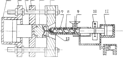 Рис. 1. Способ червячной пластикации материала и приводов в литьевом оборудовании для всех этих материалов имеют много общего. Способ пластикации и ввода материала в форму, показанный на рис. 1, получил наибольшее распространение и является общим для всех трёх классов полимерных материалов. Перерабатываемый материал в виде шнура, ленты или порошка из бункера 9 захватывается червяком 7 через загрузочное отверстие пластикационного цилиндра 8 и транспортируется в его переднюю часть. При этом материал нагревается до температуры плавления как вследствие работы деформирования в канале червяка, так и за счёт подвода тепла от стенок пластикационного цилиндра. Подготовленный червяком расплав тем или иным способом (в зависимости от технологической разновидности метода) подаётся в оформляющую полость формы 5, нагретую до температуры 453…523 К для реактопластов и холодную – для термопластов. Вследствие дальнейшего прогрева реактопластов за счёт контакта со стенками формы в материале начинает протекать реакция отверждения (вулканизации для резин). В случае переработки термопластов как во время, так и после заполнения формы в результате контакта с холодными стенками расплав интенсивно охлаждается, уменьшаясь в объёме. Во избежание выделения летучих веществ, для устранения пористости изделий, усадочных раковин в форме необходимо определённое время поддерживать давление извне. Оно создаётся червяком 7, находящимся под воздействием осевого усилия от гидроцилиндра 11. Давление поддерживается до тех пор, пока расплав в летнике и оформляющей полости формы потеряет свойство текучести. Затем готовое изделие извлекается из формы. Кинематические перемещения в механизмах запирания форм осуществляются механическими и гидромеханическими устройствами или гидравлическим цилиндром; усилие запирания создаётся также гидроцилиндром. Гидропривод работает с помощью насосов и командно-силовых механизмов (гидроцилиндров, золотников, клапанов и т.д.), которые образуют единую гидравлическую систему. Конструктивные особенности литьевой машины определяет сложность гидравлической системы.