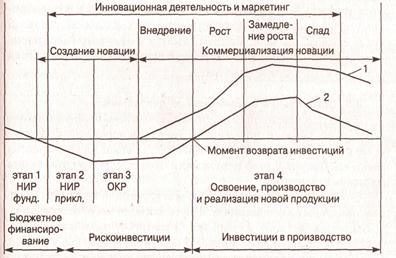 Рис. 19.1. Основные этапы инновационного процесса: 1 — объем продаж; 2 — объем прибыли