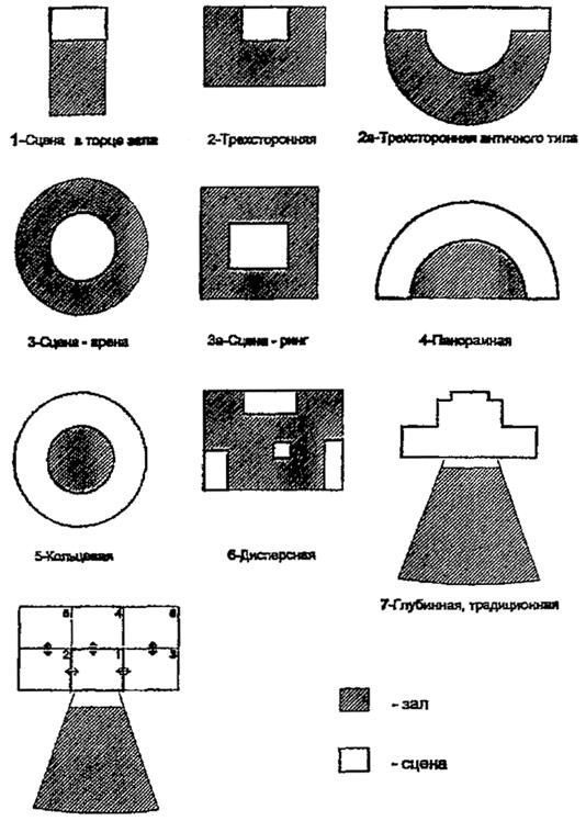 8 - Система подвижных взаимозаменяемых сценических планшетов с движением планшетов по горизонтали и вертикали Рис.1. Типы сцен. Схемы взаимосвязи зала и сцены