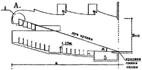 Рис.1. Расчетные параметры зрительных залов с колосниковой глубинной портальной сцены А – разрез, Б - план; 1 - сцена, 2 - арьерсцена, 3 - карманы, 4 - авансцена, 5 - оркестровая яма; а - длина зала, б - превышение луча зрениязрителя над головой впереди сидячего, в - вертикальный угол размещения зрительских мест, г - горизонтальный угол размещения зрительских мест, д - вертикальный угол размещения зрит. мест Таблица 3.