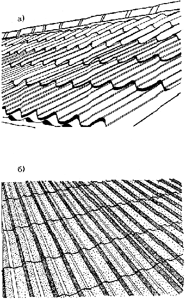 Основание кровли из металлочерепицы мало чем отличается от основания под стальную кровлю, однако большая жесткость металлочерепицы позволяет обрешетку выполнять из брусков сечением 40x60 мм и укладывать их с шагом 350 мм, в то время как для обычной стальной кровли этот шаг составляет 200-270 мм. Безусловно, сечение обрешетки зависит и от действующих нагрузок (снег, ветер и т.п.), и от шага стропил. Требования по антисептированию, огнезащите древесины и рекомендации по породам древесины те же, что и для кровли из стальных оцинкованных листов (рис.3).
