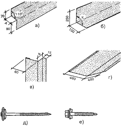 а - планка с внутренним и наружным углом, длина 2000 мм, на все типы профиля; б - планка для швов и стыков, длина 300 мм, на все типы профиля; в - боковая планка, длина 2000 мм, на все типы профиля; г - планка для разжелобка, длина 2000 мм; д - гвоздь с уплотнительной шайбой; е - самонарезающий шуруп 4,8x28 с уплотнительной шайбой и головкой под любой цвет профиля