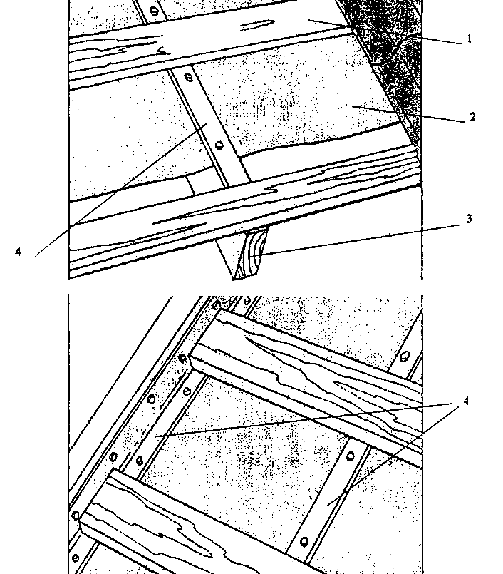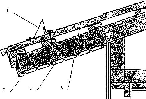 1 - обрешетка; 2 - прокладка; 3 - стропильная балка; 4 - планка над стропильной балкой